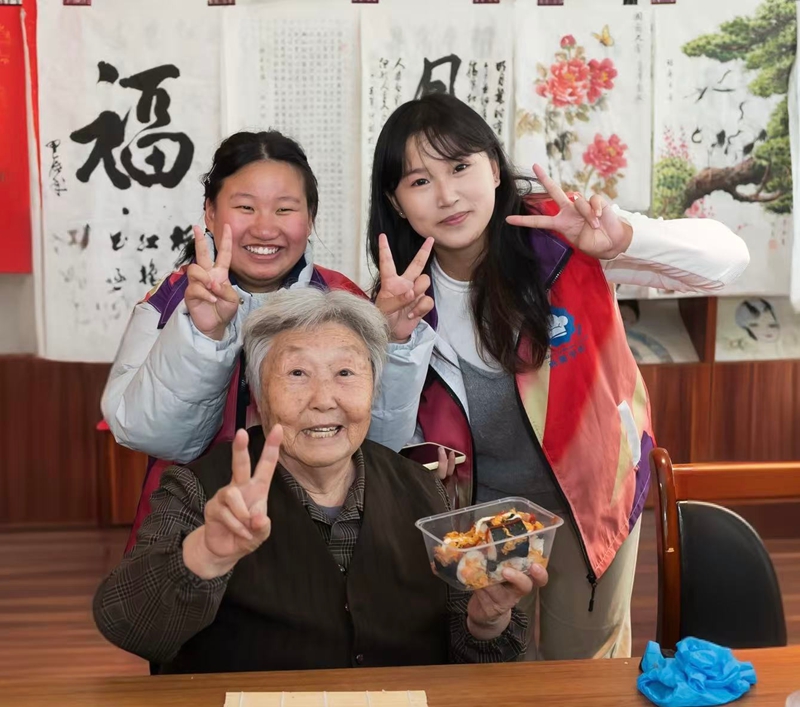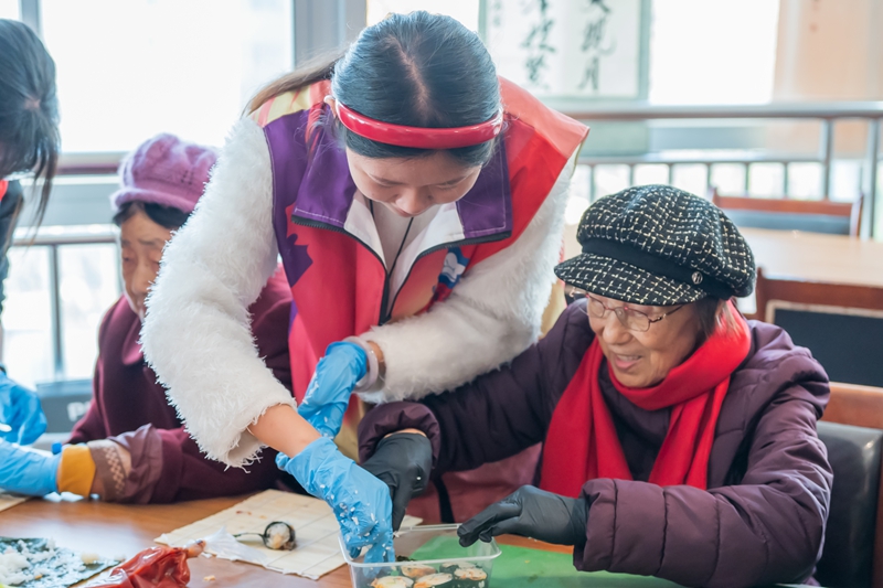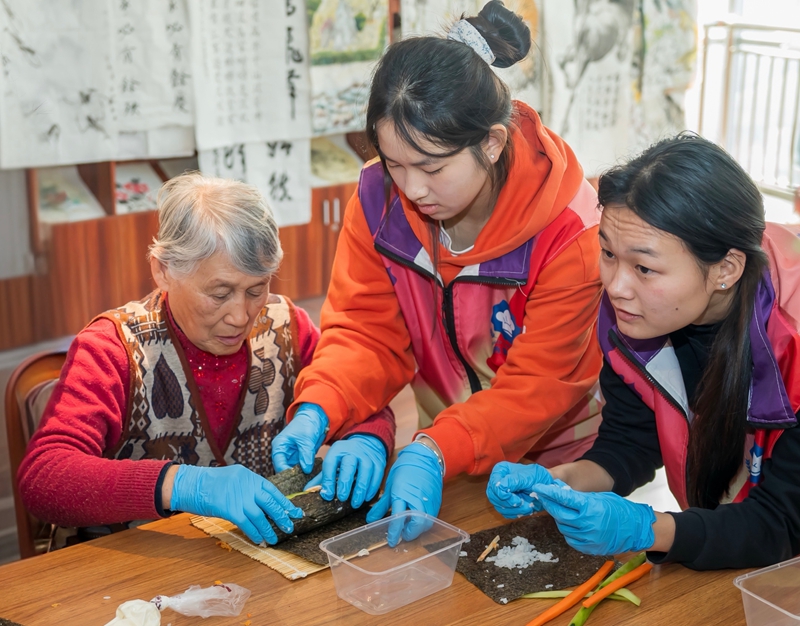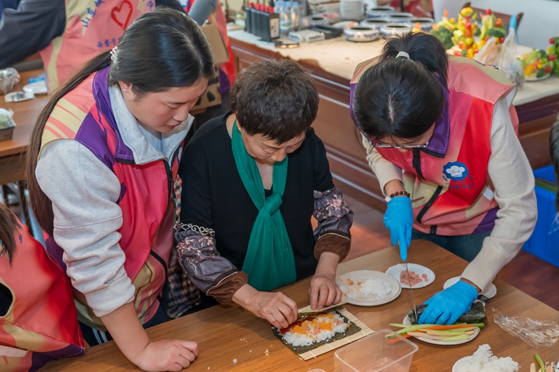 在金色主題環(huán)節(jié),壽司制作活動成為代際融合與技藝傳承的實踐平臺。老年人與學生結(jié)對合作,從鋪米、配料到卷制、切分,全流程共同完成。年輕志愿者在輔助長者嘗試新式餐飲制作的同時,也接收到來自長者的食物處理經(jīng)驗與操作智慧。