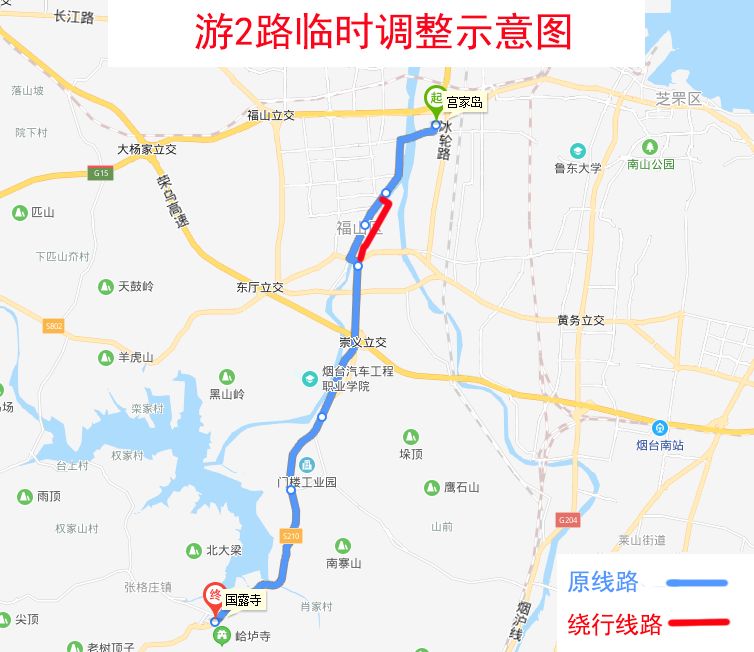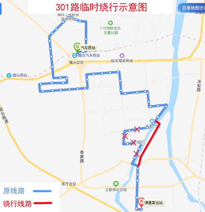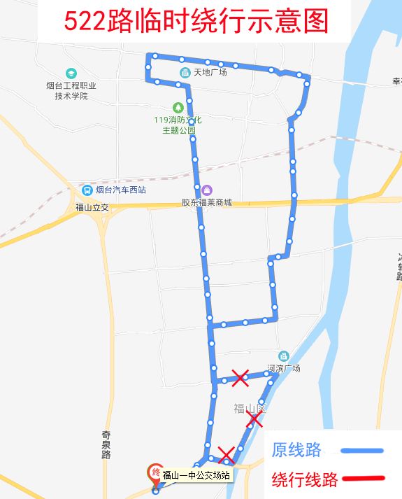 由福山一中場站發(fā)車,沿原線路運行至港城西大街與福海路交叉口左轉(福山一中場站至開發(fā)區(qū)方向),沿福海路運行至福海路與永安街交叉口直行恢復原線路。