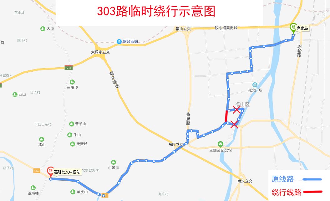 由高疃中樞站發(fā)車,沿原線路運行至港城西大街與福海路交叉口左轉,沿福海路運行至福海路與城里街交叉口直行恢復原線路。