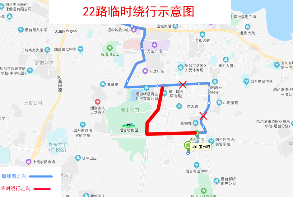 由塔山游樂城發(fā)車,沿原線路行至奇山東街與紅旗中路交叉口左轉(zhuǎn),沿紅旗中路、通世路行至通世路與環(huán)山路交叉口直行恢復(fù)原線路。