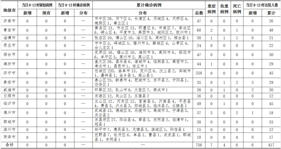 2020年2月29日0-12時,山東省無新冠肺炎疑似病例;無新增確診病例,累計確診病例756例(其中,重癥病例7例,危重癥病例4例,死亡病例6例);新增治愈出院6例,累計治愈出院417例。截至目前,追蹤到密切接觸者16851人,已解除醫(yī)學(xué)觀察15755人,診斷為疑似或確診病例291例,尚有805人正在接受醫(yī)學(xué)觀察。