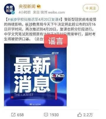 謠言:2月27日,一張“央視新聞”的微博截圖在家長群、朋友圈傳播。截圖顯示“長沙教育局今天下午決定將此前公布的3月16日開學時間,再次推遲到4月20日,復課也將分階段進行”。