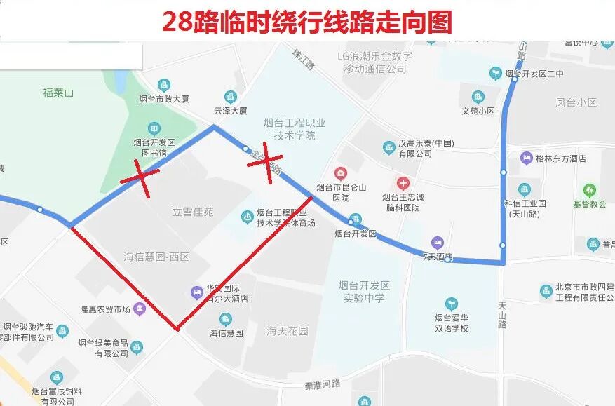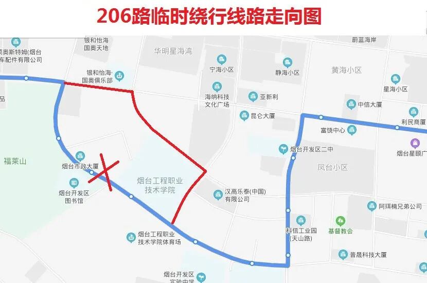 取消:海信慧園西區(qū)、開發(fā)區(qū)圖書館、煙臺(tái)工程職業(yè)技術(shù)學(xué)院西門、煙臺(tái)工程職業(yè)技術(shù)學(xué)院、煙臺(tái)昆侖山醫(yī)院等5處站點(diǎn)。