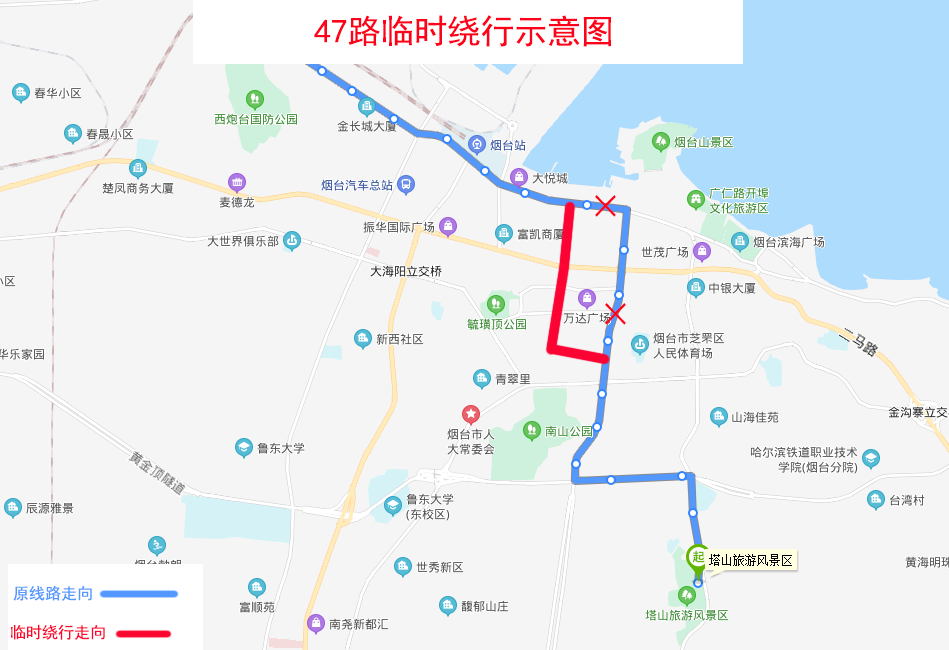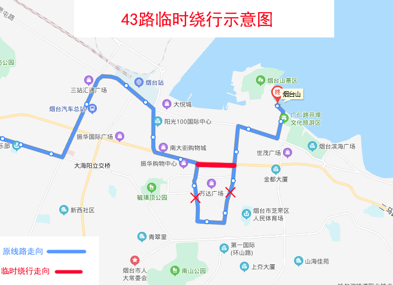 由煙臺(tái)南站發(fā)車,沿原線路行至勝利路與建昌南街交叉口左轉(zhuǎn),沿建昌南街、西南河路行至西南河路與南大街交叉口左轉(zhuǎn)恢復(fù)原線路。