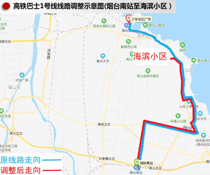 高鐵巴士1號(hào)線由煙臺(tái)南站發(fā)車,沿原線路行至觀海路與紅旗東路交叉口左轉(zhuǎn),沿紅旗東路行至海濱小區(qū)場站。