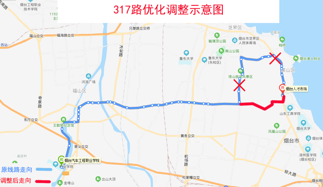 317路由煙臺(tái)汽車工程職業(yè)學(xué)院發(fā)車,沿原線路行至鳳鳴路與山海路交叉口直行,沿鳳鳴路、竹林南路、竹林路、觀海路行至煙臺(tái)人才市場,調(diào)整后首末班時(shí)間不變。
