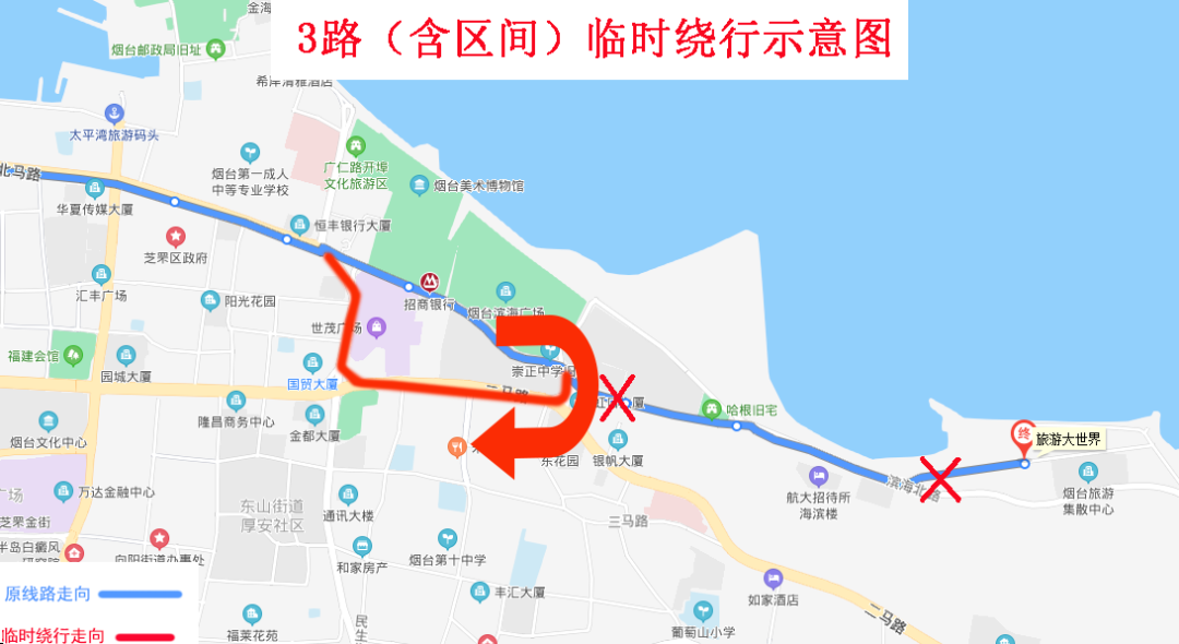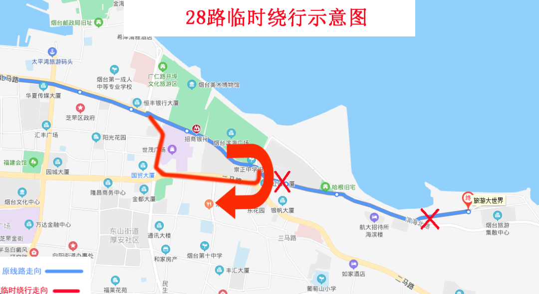 因道路改造施工,煙臺(tái)市區(qū)大馬路(虹口路至濱海北路)4月17—18日全封閉,禁止通行,3路(含區(qū)間)、17路、28路、38路、49路(含區(qū)間)等5條公交線路臨時(shí)繞行,具體方案如下: