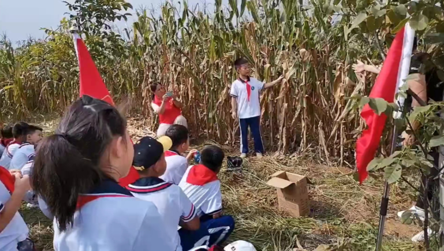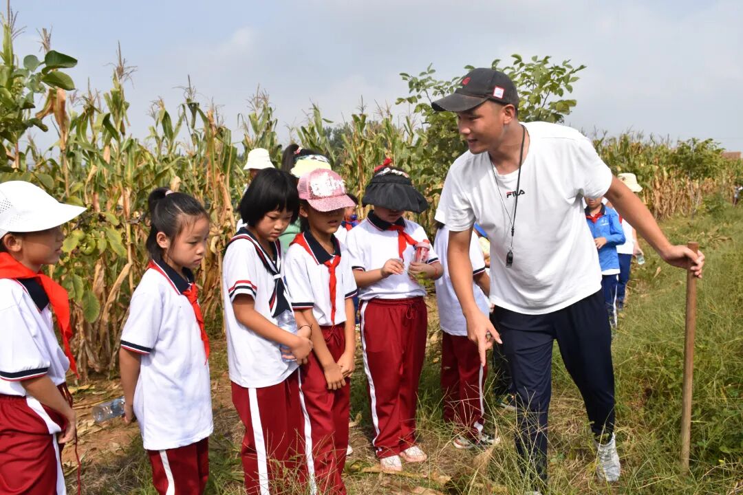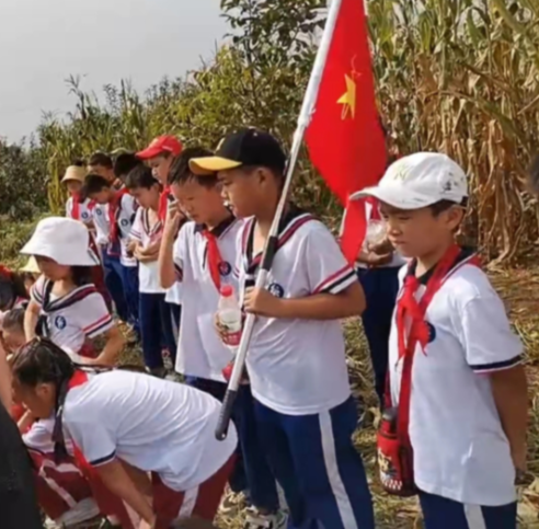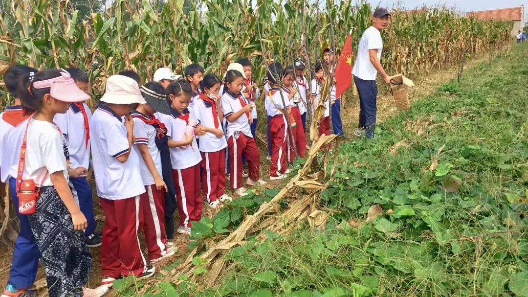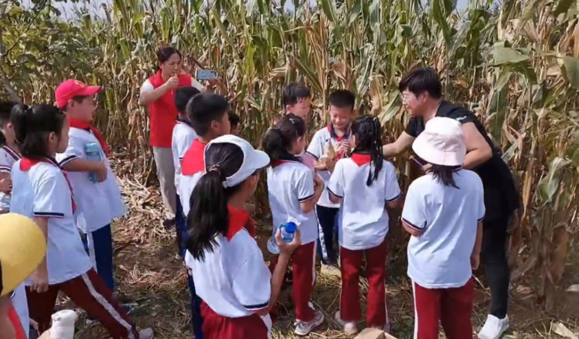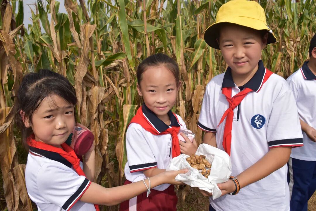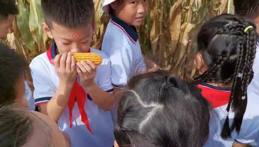 葡萄園對面就是玉米地,咦,那里還隱藏著一穗玉米呢!孩子們歡呼起來,撕開玉米葉,金燦燦的玉米棒子露出來啦!大家摸一摸,聞一聞,豐收的味道可真迷人。