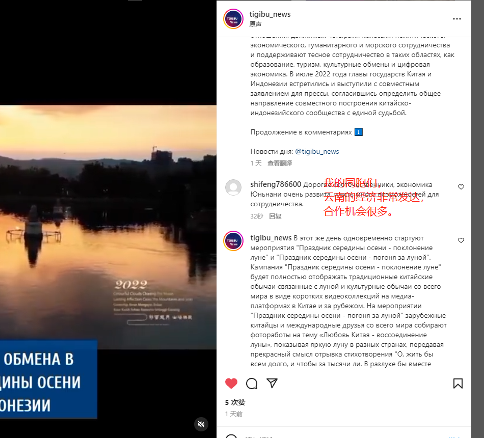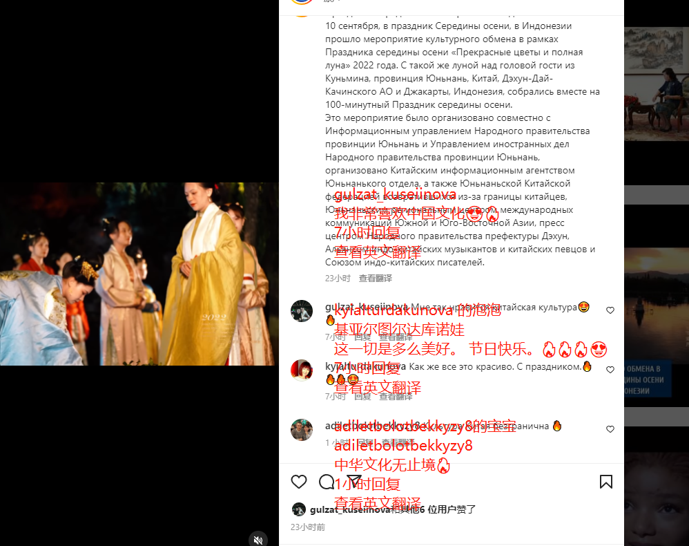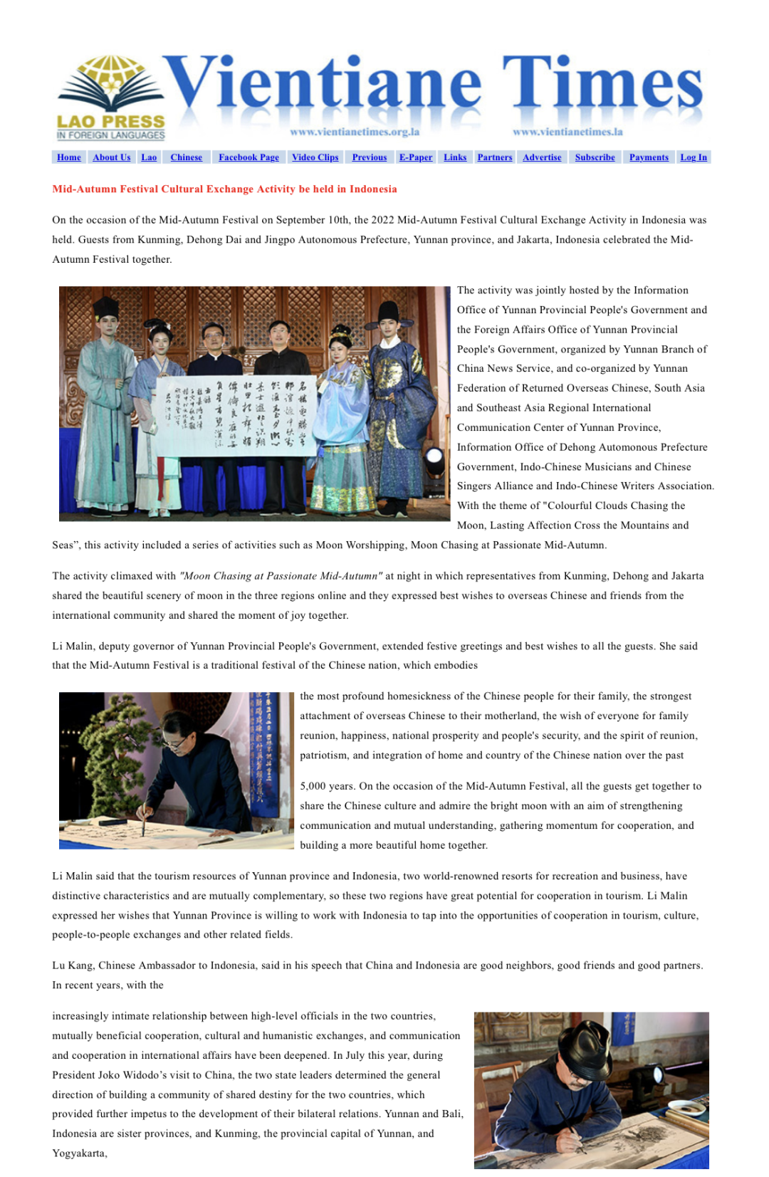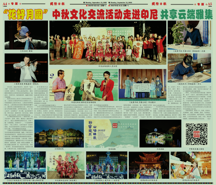 9月10日,由云南省人民政府新聞辦公室、云南省人民政府外事辦公室聯(lián)合主辦,中國新聞社云南分社承辦的2022年“花好月圓”中秋文化交流活動走進印度尼西亞正式啟動,以新穎的活動形式,詮釋了“海上生明月,天涯共此時”的美好意境和“美美與共,天下大同”的世界胸懷,受到眾多外媒關(guān)注。尤其是兩國三地藝術(shù)家,以書畫會友、用筆墨傳情、借歌舞表意,再續(xù)古人的風(fēng)雅之情,更是獲得海內(nèi)外網(wǎng)友一致稱贊。大家紛紛贊嘆:“詩意中秋節(jié),醇厚云南美”“活動太有意義了,天涯共此時、千里共嬋娟的格局一下就打開了”……