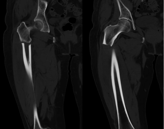 手術治療:手術治療對于完全性非典型股骨骨折主要有髓內釘治療以及鋼板內固定治療。其中髓內釘固定可靠。但部分老年人股骨前弓過大,不適宜用髓內釘固定。本例患者股骨前弓較大,但尚可用髓內釘固定。術后股骨正常前弓減小。術后時間尚短,還需繼續(xù)隨訪。