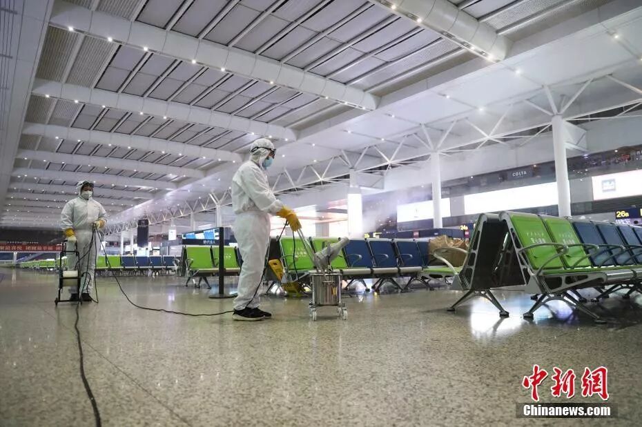 資料圖:工作人員對(duì)候車大廳內(nèi)的座椅進(jìn)行消毒。張亨偉 攝