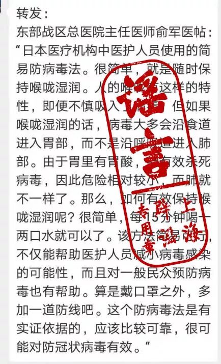 謠言:網(wǎng)上熱傳“15分鐘喝水一次可預(yù)防新型冠狀肺炎病毒”的“簡易防病毒法”。