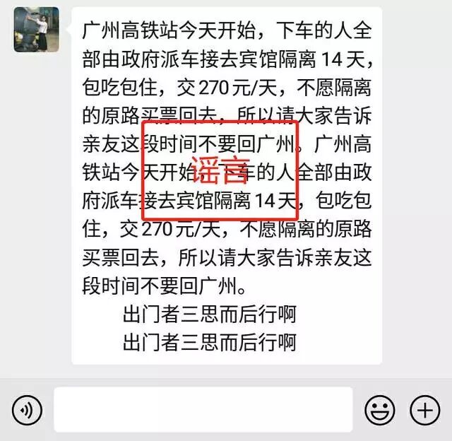 謠言:近日有一段微信聊天記錄:“廣州高鐵站下車的人全部由政府派車接去賓館隔離14天,不愿隔離的原路買票回去。”的信息在網(wǎng)絡(luò)上流傳。