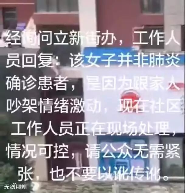 謠言:昨日,網(wǎng)傳荊州市沙市區(qū)塔橋路有名肺炎確診患者從家中跳樓逃跑,相關(guān)視頻在微信群瘋傳。