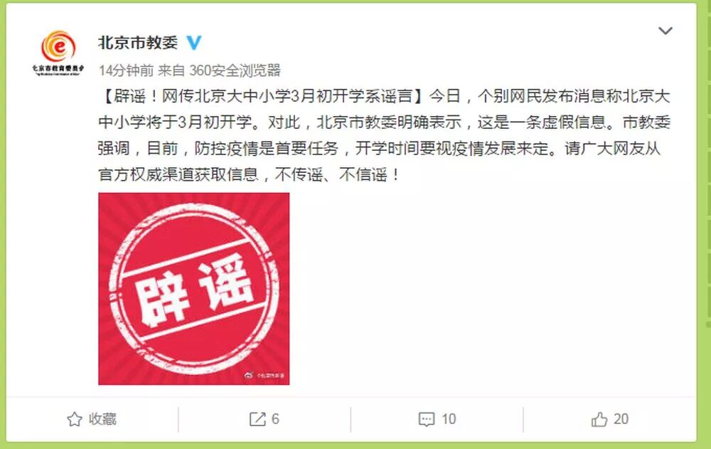 謠言:今日,個別網(wǎng)民發(fā)布消息稱北京大中小學(xué)將于3月初開學(xué)。