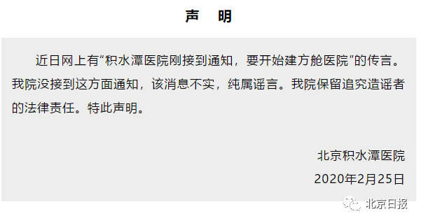 北京積水潭醫(yī)院2月25日在官微發(fā)出聲明,表示“積水潭醫(yī)院剛接到通知,要開始建方艙醫(yī)院”是謠言。