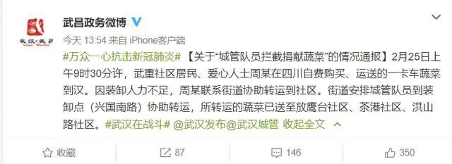 據(jù)了解,2月25日上午9時30分許,武重社區(qū)居民、愛心人士周某在四川自費購買、運送的一卡車蔬菜到漢。因裝卸人力不足,周某聯(lián)系街道協(xié)助轉(zhuǎn)運到社區(qū)。按照武漢市水果湖街道辦事處統(tǒng)一調(diào)度安排,駐街城管執(zhí)法中隊前往興國南路幫助轉(zhuǎn)運愛心人士捐贈的蔬菜,分別運送到洪山路社區(qū)、茶港社區(qū)、放鷹臺社區(qū),并非視頻“拍攝者”所稱的搶蔬菜。