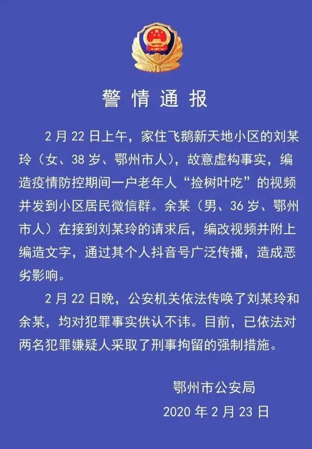 2月23日,湖北省鄂州市公安局發(fā)布警情通報稱:2月22日上午,家住飛鵝新天地小區(qū)的劉某玲故意虛構(gòu)事實,編造疫情防控期間一戶老年人“撿樹葉吃”的視頻并發(fā)到小區(qū)居民微信群。余某在接到劉某玲的請求后,編改視頻并附上編造文字,通過其個人短視頻賬號廣泛傳播,造成惡劣影響。