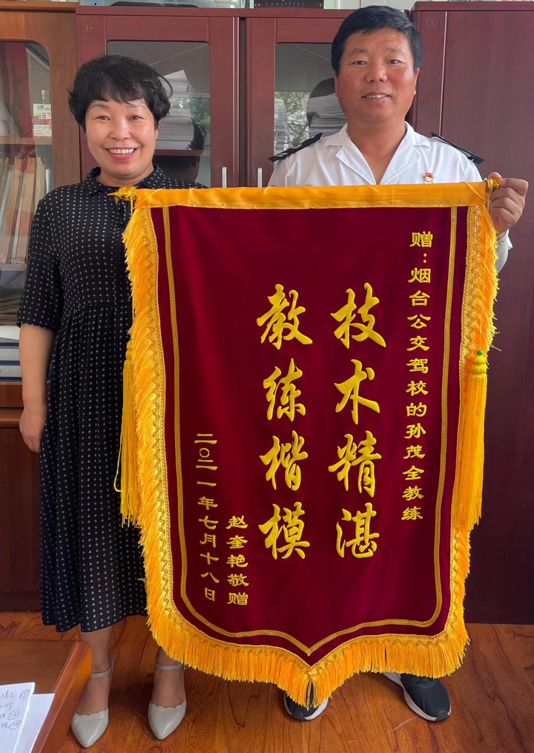 7月19日一大早,學(xué)員趙奎艷阿姨興高采烈地帶著一面寫有“技術(shù)精湛 教練楷!钡腻\旗來到公交駕校送給孫茂全教練,向在學(xué)車期間對學(xué)員辛苦付出和悉心教導(dǎo)的孫教練表達(dá)了深深的感激之情。