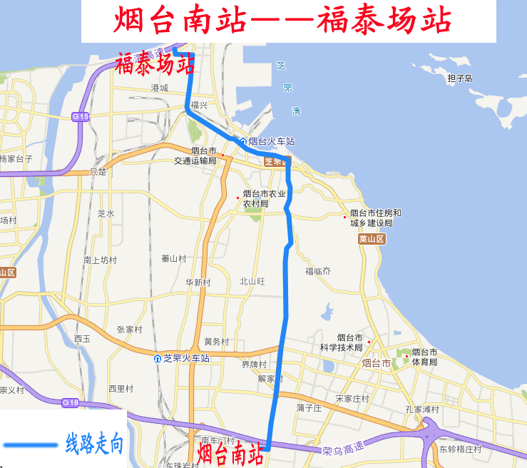 由煙臺(tái)南站發(fā)車,沿?zé)熍_(tái)南站南路、通世南路、荊山路、勝利南路、勝利路、南大街、海港路、北馬路、芝罘屯路、幸福路、祥禎路、福成路運(yùn)行至福泰場(chǎng)站。