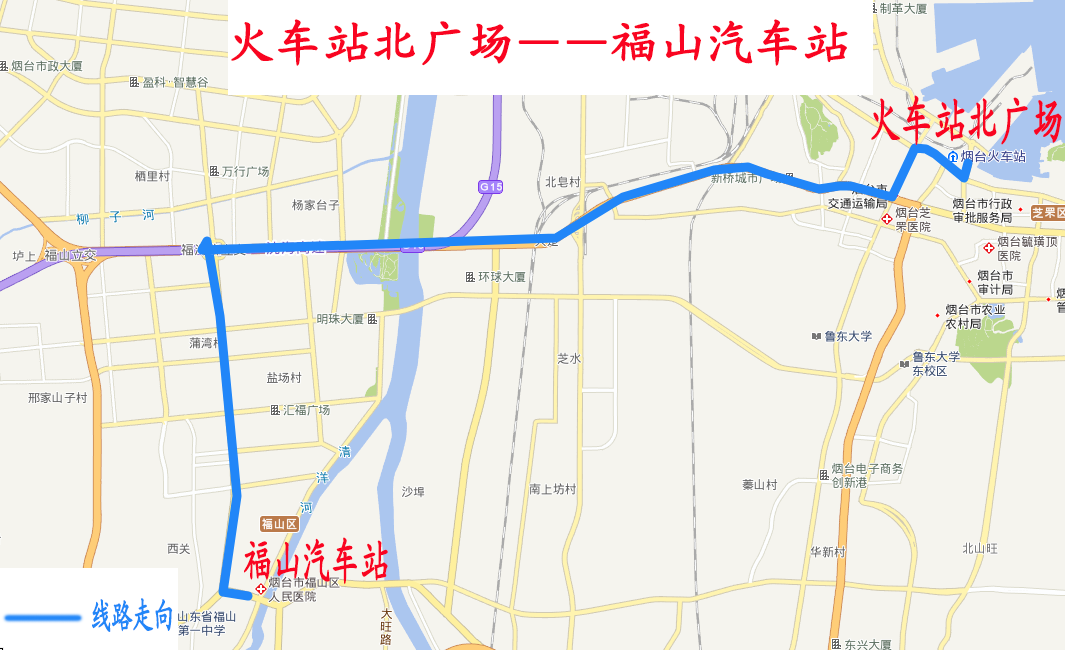 由火車站北廣場(chǎng)發(fā)車,沿海港路、北馬路、青年路、南大街、只楚路、福海路、港城西大街運(yùn)行至福山汽車站。