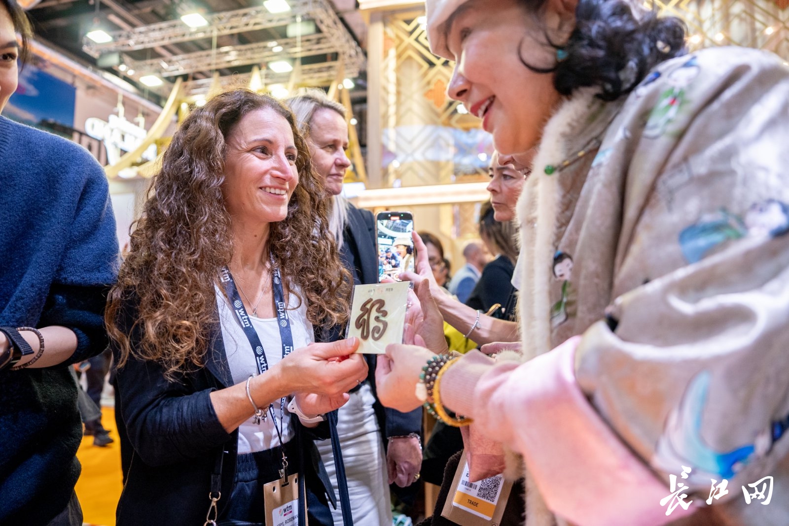 活動(dòng)現(xiàn)場(chǎng),外國(guó)嘉賓與“楚香”非遺傳承人韓雪交流,感受湖北楚香文化。彭泉錦 攝