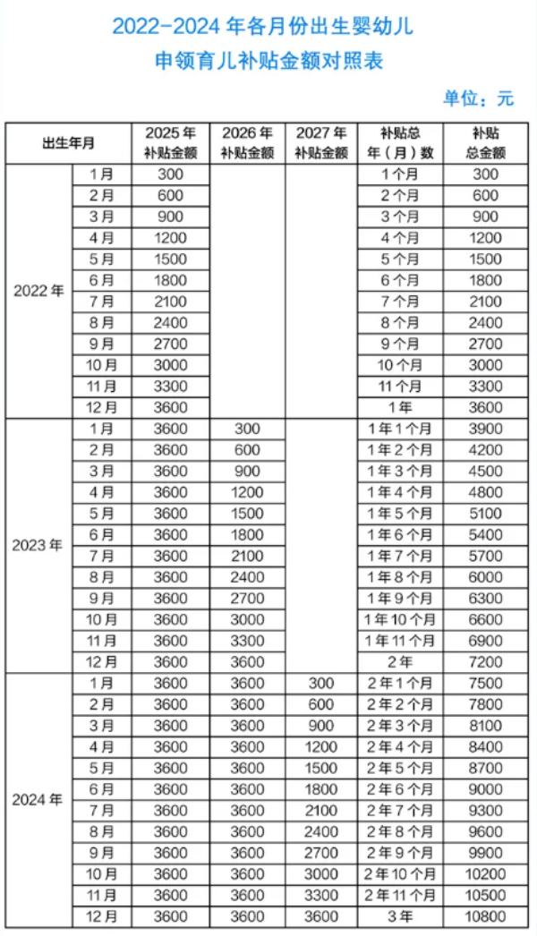 2025年7月,《育兒補貼制度實施方案》正式發(fā)布,明確對符合法律法規(guī)規(guī)定生育的3周歲以下嬰幼兒發(fā)放育兒補貼。根據(jù)方案,2022年出生的嬰幼兒,可申領一次,應當在2025年提出申請;2023年出生的嬰幼兒,可申領2次,分別在2025年和2026年提出申請;2024年出生的嬰幼兒,可申領3次,分別在2025年、2026年和2027年提出申請。每個孩子能夠申領的金額,具體參見下表。