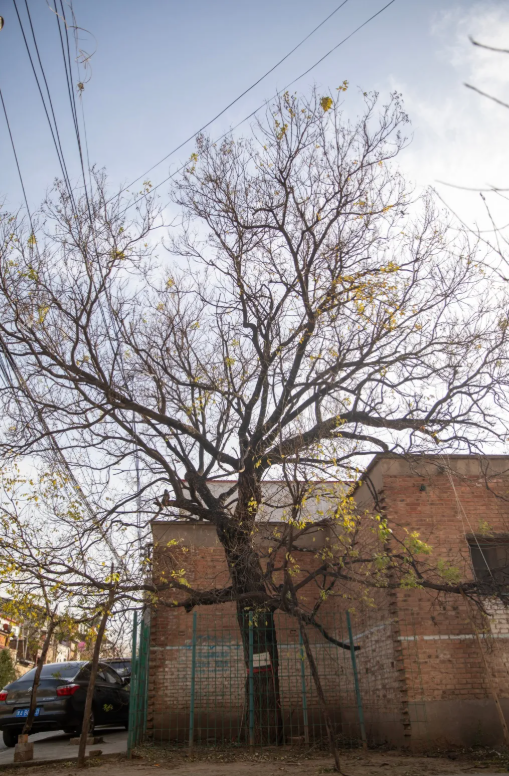 S053鄉(xiāng)道兩側(cè),整齊排列的民房中,一座平房在西北邊缺了一個(gè)角,留出了大約10平方米的空間。這棵180多歲的國槐就長在了缺角處。