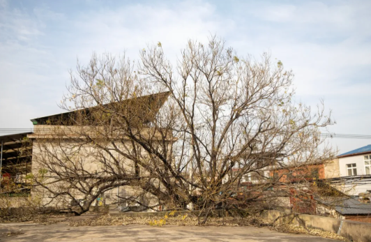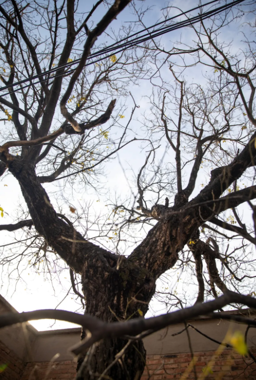 紅色的磚墻向內(nèi)呈直角,像是撐開的雙臂,要把古樹抱起來;樹的枝干又向上生長,用自己的枝葉為平房遮風(fēng)擋雨。國槐與平房,構(gòu)成了一幅獨(dú)特又質(zhì)樸的畫面。