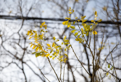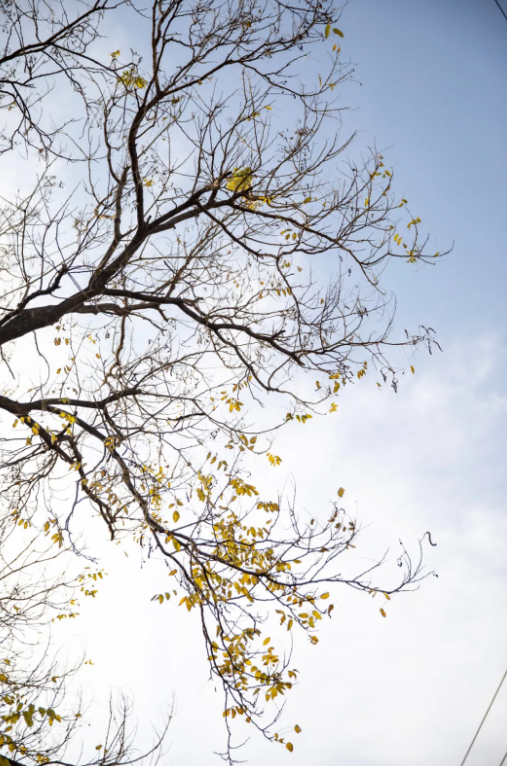 初冬時(shí)節(jié),褪去樹葉的國槐,向人們展現(xiàn)了斑駁的美。它的樹干粗壯,樹皮皸裂,枝干交錯(cuò)縱橫地生長著,有些已伸到了路邊,有些越過了平房的屋頂。僅剩下的稀疏葉片在陽光下泛著黃色,展現(xiàn)著古樹的生機(jī)。
