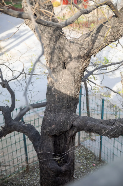 院門朝南,正面和左側(cè)的平房和周圍的樓房比起來,顯得低矮了不少,西北角的古樹卻支撐起了小院的高度。85歲的武照花站在房門口的陽光下對(duì)我們說:“這棵樹本來是長在我們家院子里的,30多年前,村里修路,我們家的宅基地往南移了,這棵樹就到了路邊。”