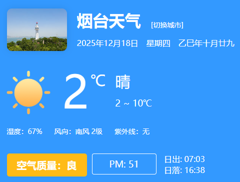 東部海域(開發(fā)區(qū)至牟平區(qū))將有1.0米的輕浪,風(fēng)浪向西南;平均水溫:6.6-7.7℃;